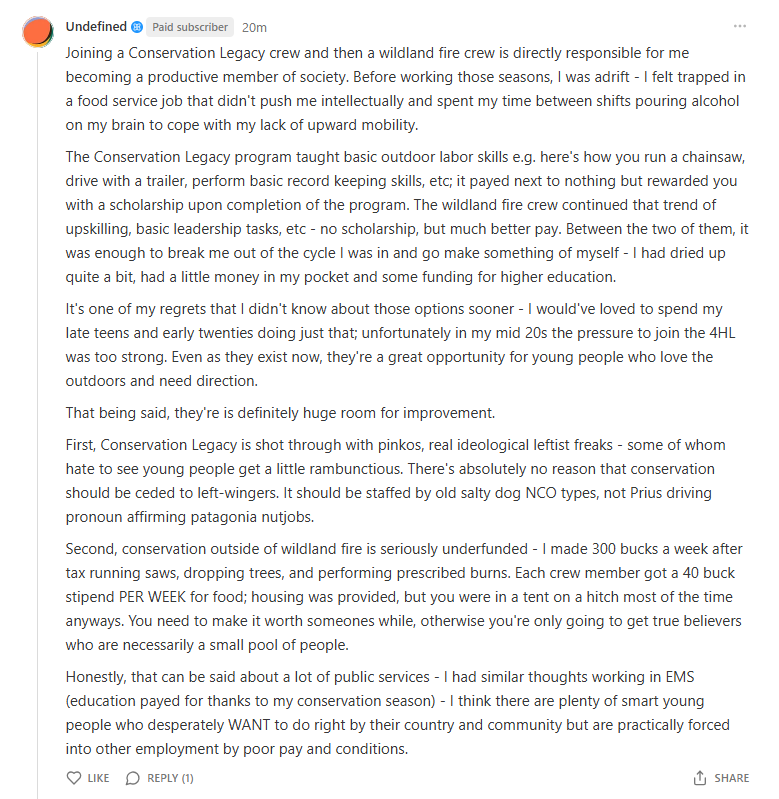 Update: One of my beloved paid subscribers left a comment about his time in a wilderness firefighting crew that was so good I feel compelled to repost it here for the unwashed free subscriber masses. I think these firefighting programs could be incorporated into the CCC very easily. Pay participants properly, recruit 30,000+ new firefighters/forest managers, and have the military help out with the administration/logistics. This would be a great launching point for young people.