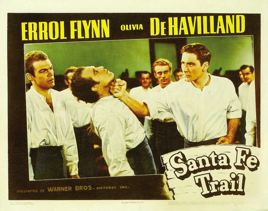 Imagine my pleasant surprise when I learned that there was actually an anti-John Brown Western made during 1940s. The film is Santa Fe Trail (1940), which stars Errol Flynn as future Civil War hero J. E. B. Stuart, who encountered Brown first as a young cavalry officer assigned to patrol the Kansas-Nebraska territory during the Bleeding Kansas Crisis, and then, by sheer coincidence/fate, during Brown’s infamous Raid on Harper’s Ferry, when Stuart volunteered to serve as Robert E. Lee’s aide-de-camp as Lee led the U.S. Marines who responded to Brown’s raid and eventually captured him. It was Stuart who walked into the killzone to offer Brown surrender terms and Stuart who signaled the final assault with a wave of his hat after those terms were refused.